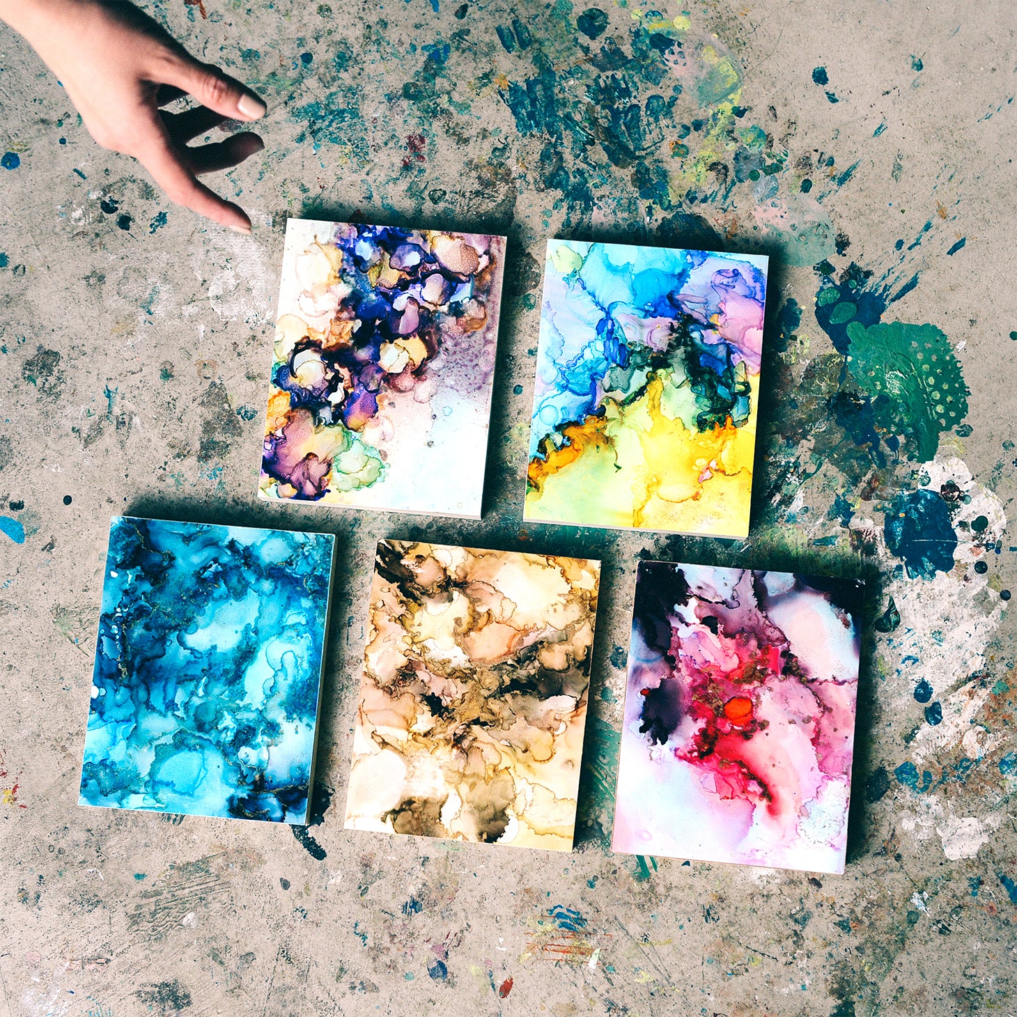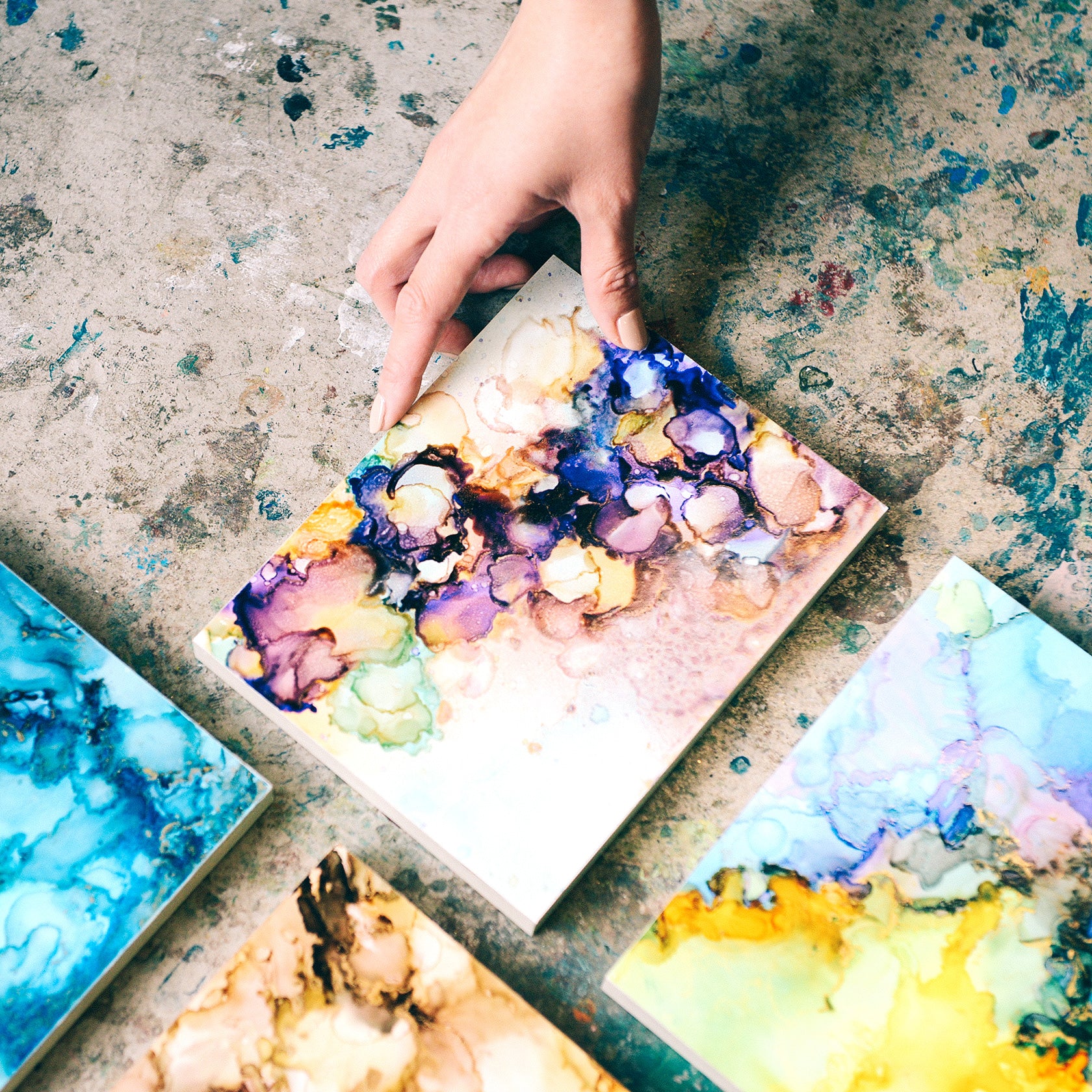 透明感あふれるインクの流れと、偶然が生み出す模様が魅力のアートです。アルコールによって広がる色が自然に重なり合い、水のような揺らぎや光のきらめきを感じさせます。心の動きをそのまま映し出す、自由で感覚的な表現です。