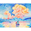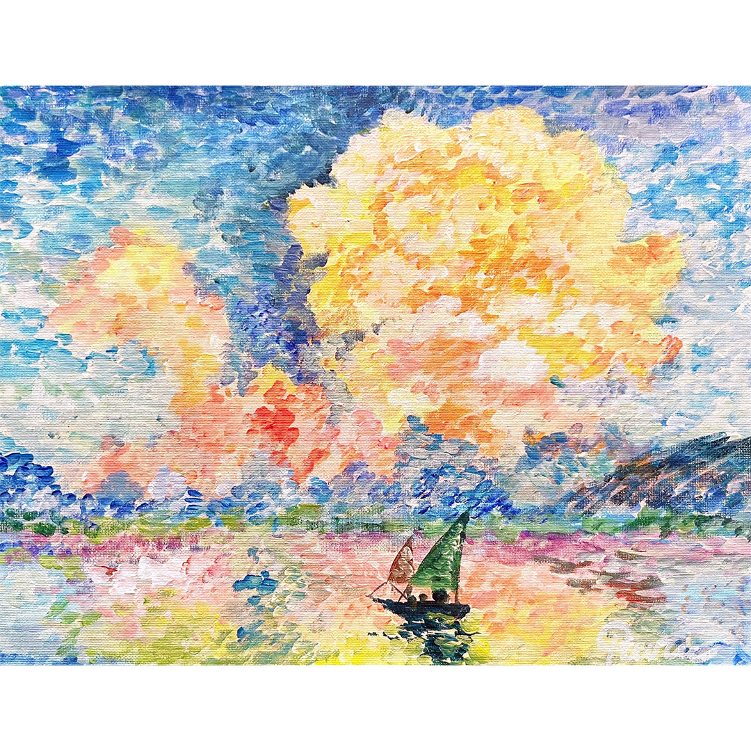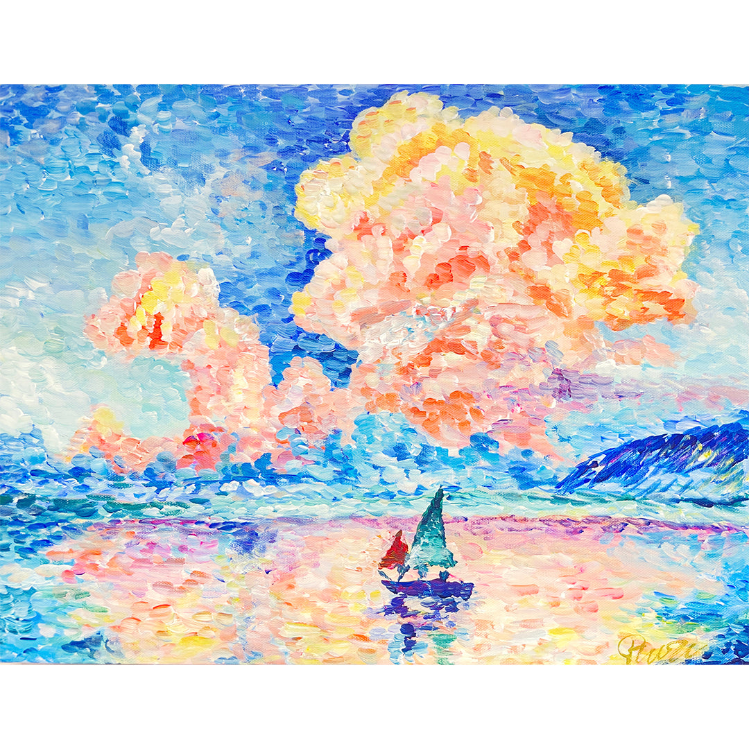 フランスの新印象派を代表する画家、ポール・シニャックが描いた《ピンク雲》は、点描技法によって空に漂う雲をやわらかなパステルカラーで表現した作品です。ピンク色の雲が広がる空は幻想的で、どこか夢のようなロマンチックな世界へと誘ってくれます。