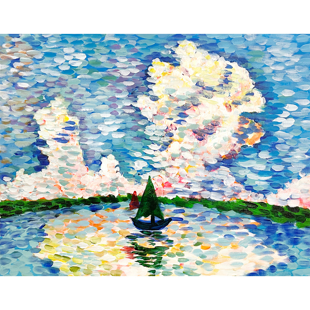 このワークショップでは、シニャックが大切にした点描技法を実際に体験します。小さな点を積み重ねながら、光の揺らめきや色の重なりを表現する過程は、まるで自然の息づかいを描きとるような感覚です。