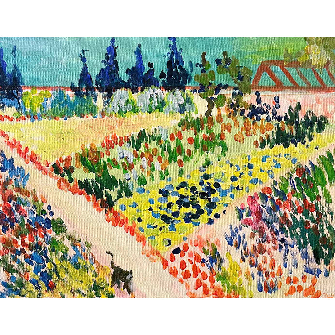 描きあげた作品には、未来へ続く旅路のような小道と、力強く咲く花々が映し出されます。キャンバスいっぱいに広がるその風景は、日常に彩りと希望を運んでくれるでしょう。