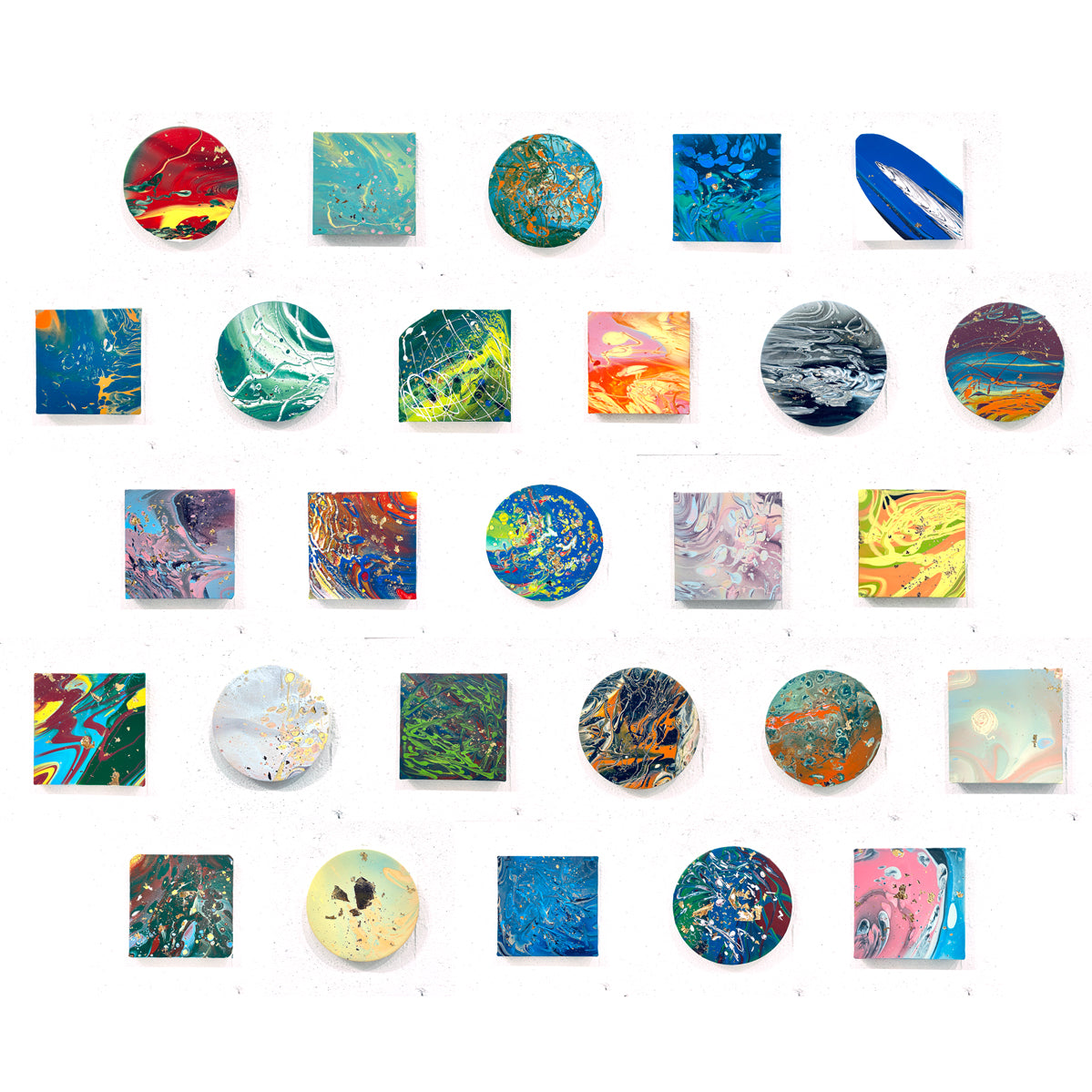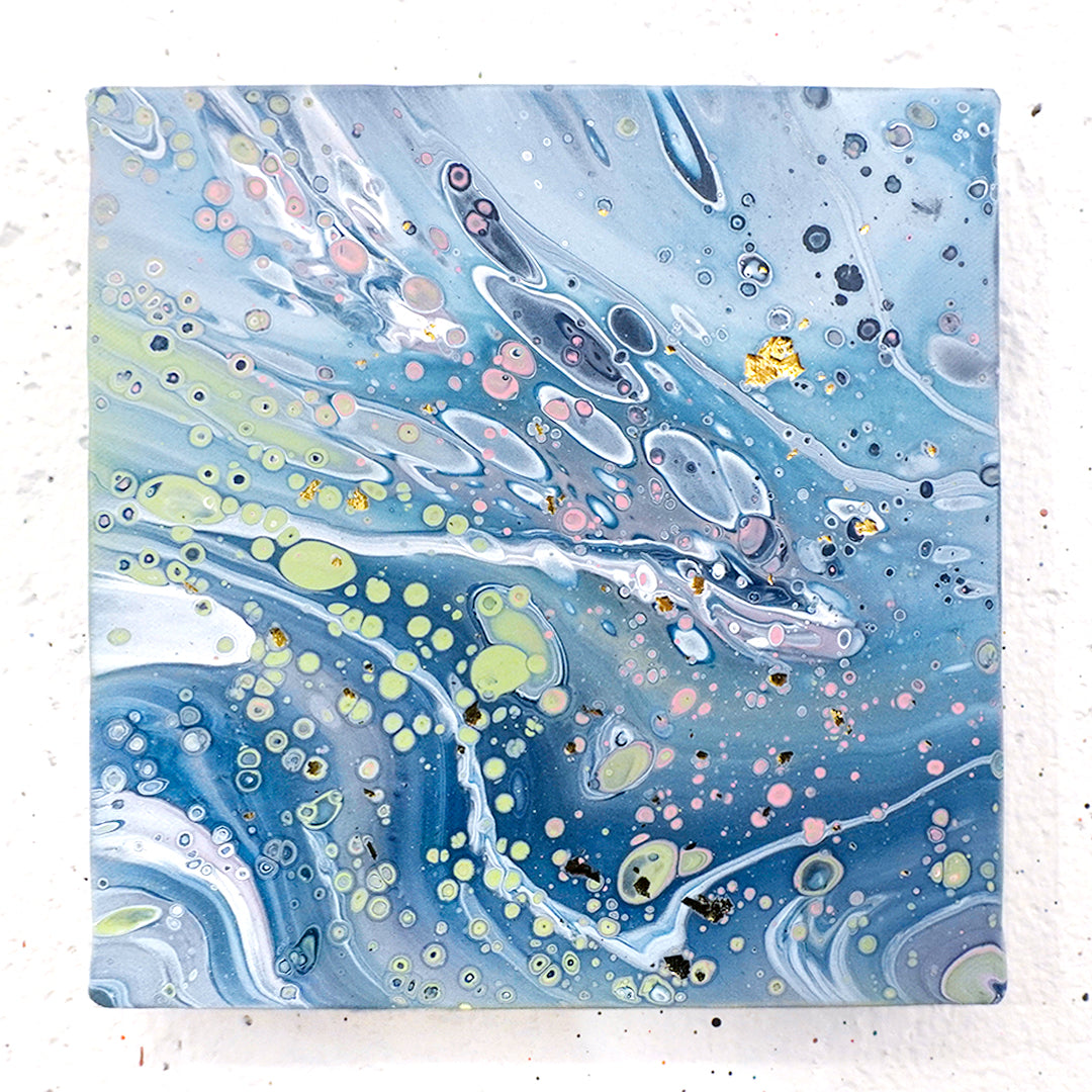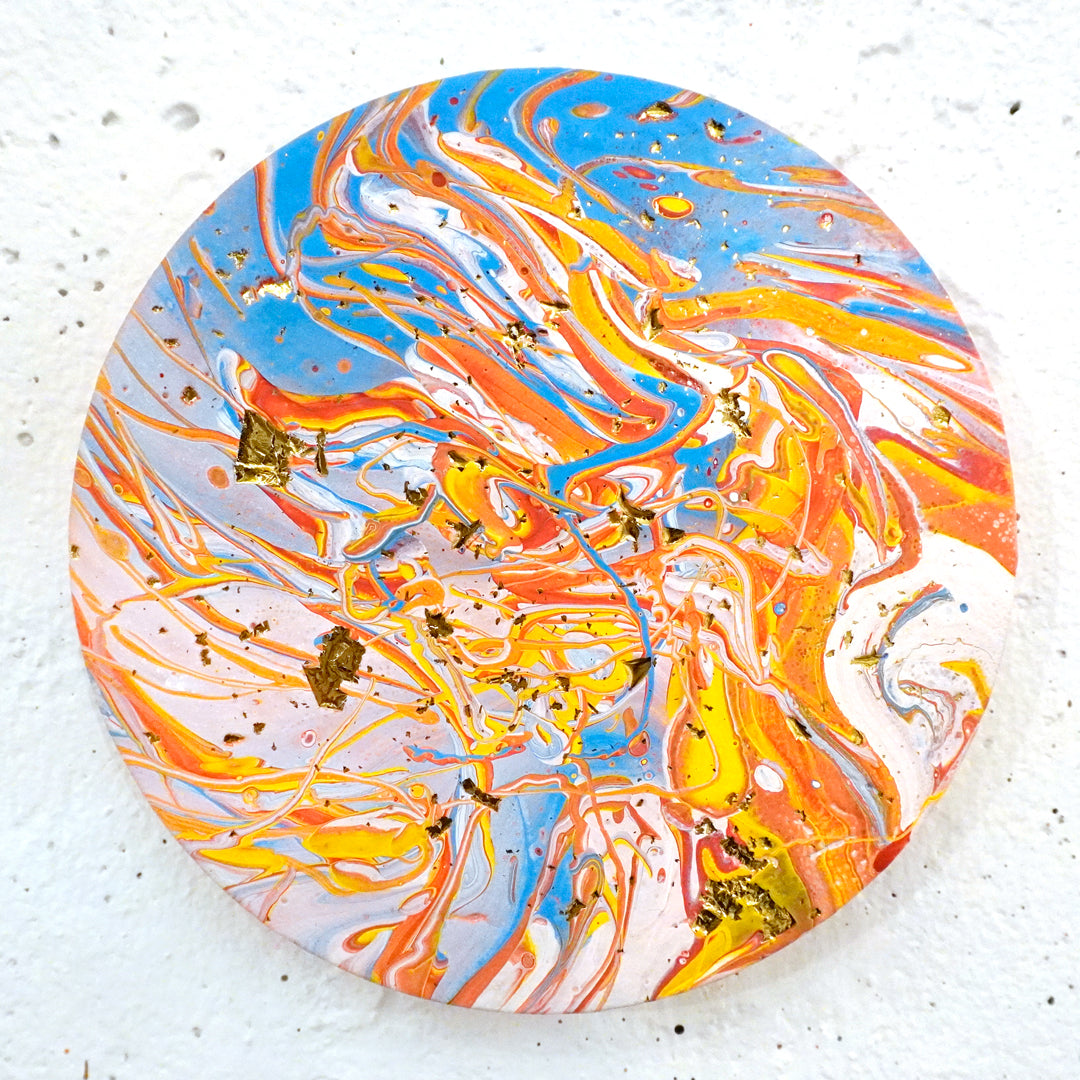 このワークショップでは、お好きな4色の液体を作り、それらを合わせてキャンバスに流し込んでいきます。コントロールし得ない偶然性による模様も楽しみながら、唯一無二の表情と色の調和を楽しみましょう。仕上げには金の装飾を施すことで、より存在感のある作品に仕上がります。