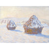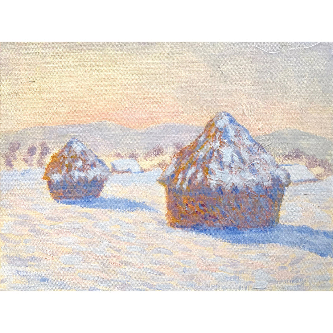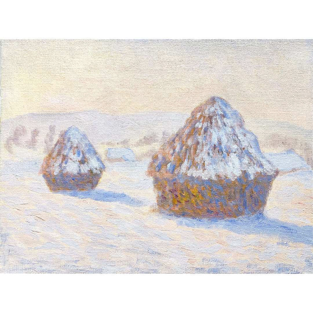 クロード・モネが手がけた「積み藁」は、季節や時間帯ごとに異なる光の表情を追い求めた連作のひとつ。単純な構図ながら、朝焼けに染まる赤や、夕暮れの黄金色、冬の柔らかな青など、刻一刻と変わる光の美しさが描き出されています。