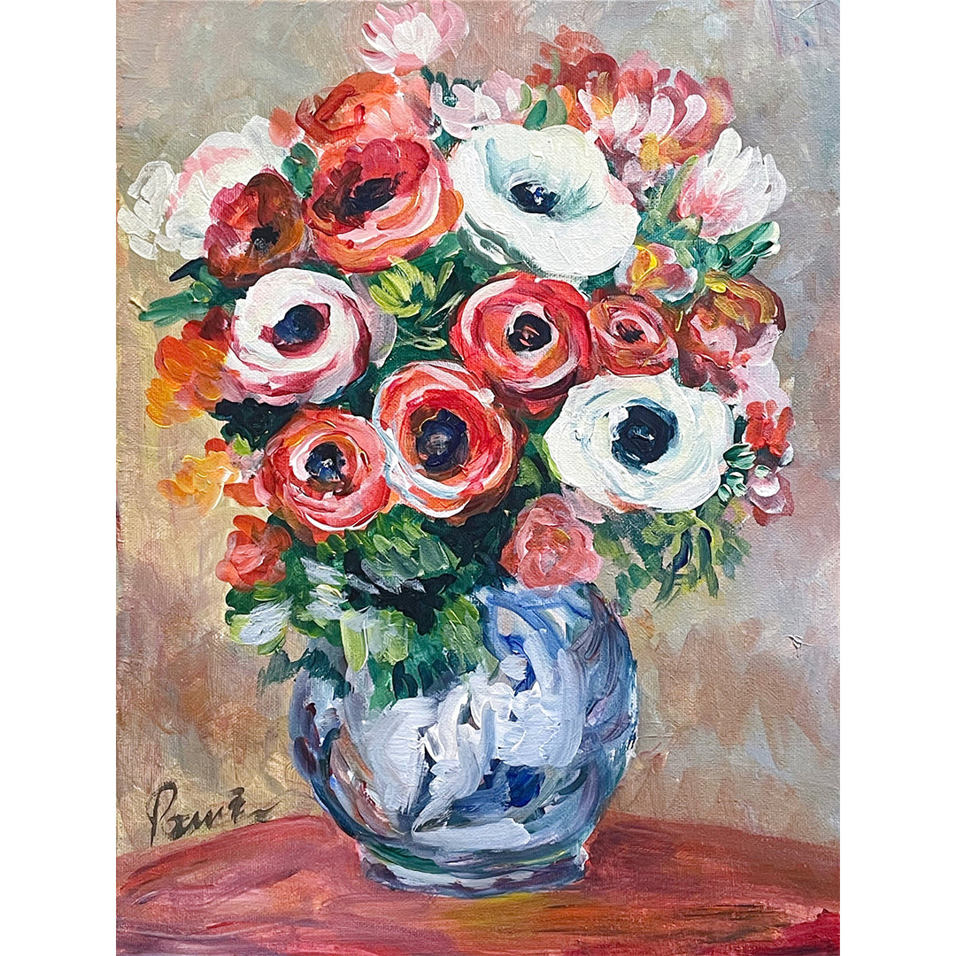 このワークショップでは、ルノワールのように花の色やかたちに光を感じ取り、柔らかな筆づかいで生命の息吹を表現します。アネモネの花が持つ愛や希望の象徴を感じながら、自身の感性も絵の中に投影していきましょう。