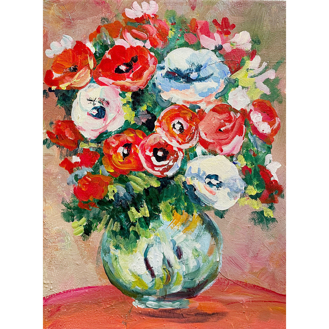 完成した作品からは、花々の柔らかな息づかいと、描き手の心が映し出された温もりが感じられるでしょう。光をまとうような色彩が空間に明るさを運び、見るたびに穏やかな幸福感が広がる一枚となります。