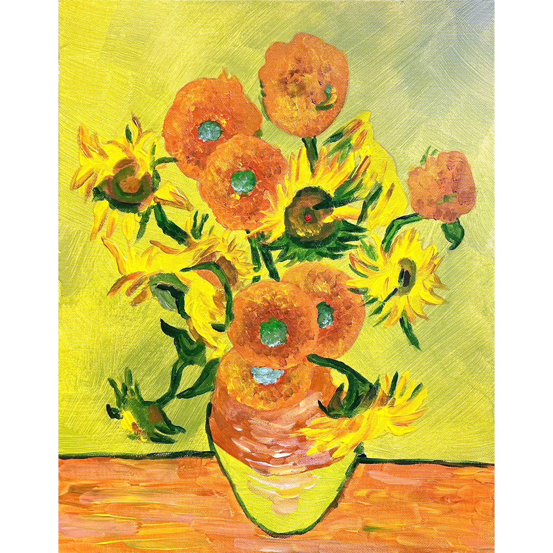 今回のワークショップでは、この「ひまわり」をモチーフに、ポスト印象派らしい鮮烈な色彩表現や、絵の具を厚く塗り重ねるインパスト技法を体験いただきます。シンプルな構図の中で、花の存在感をどう表すか──色彩の力を学びながら、自分自身の感情をキャンバスに重ねていく時間です。