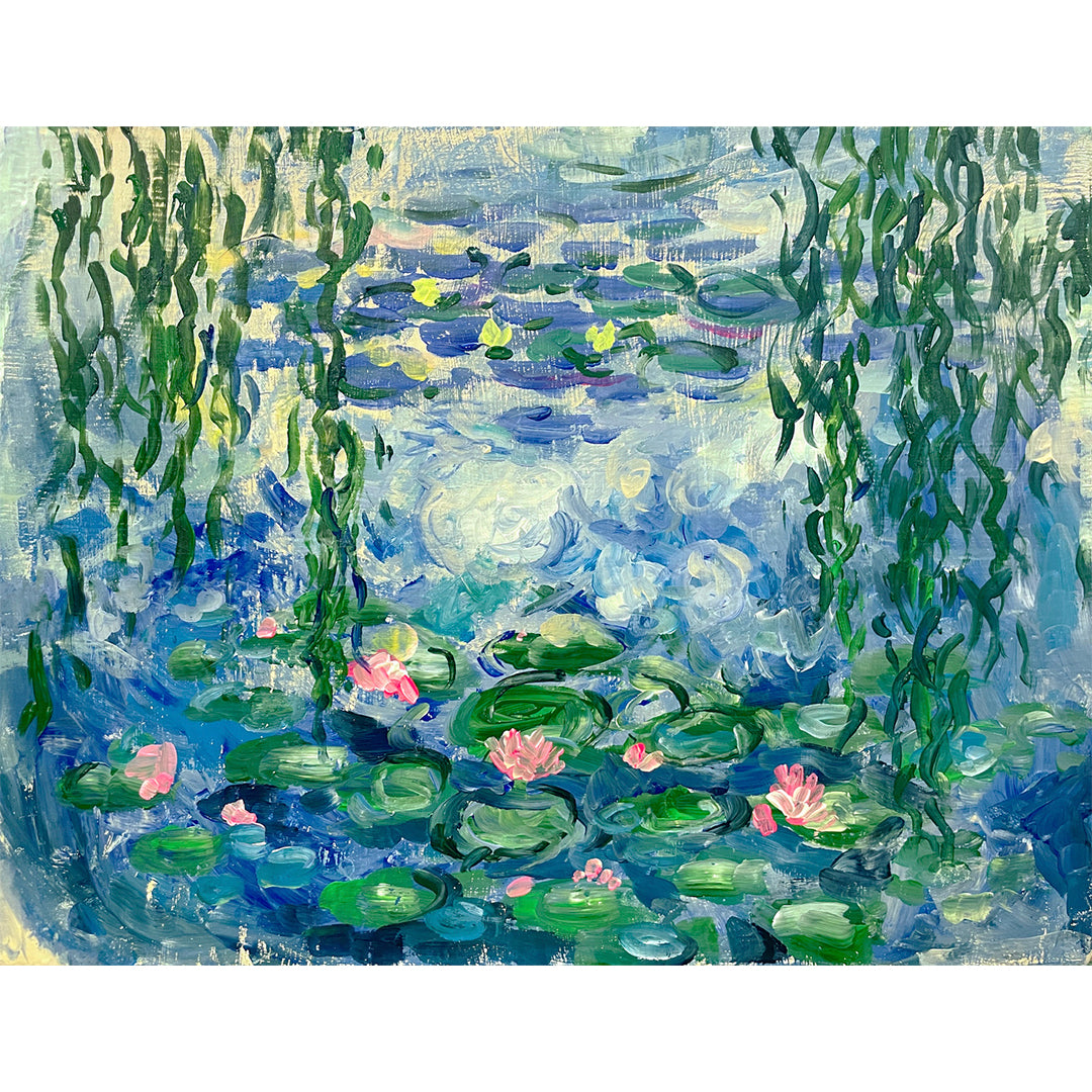 モネ晩年の代表作「睡蓮・1916-1919」は、自宅庭園の池に咲く睡蓮を幻想的に描いた作品です。水面に垂れる柳と重なり合う色彩が、内省的で静謐な空間を生み出しています。