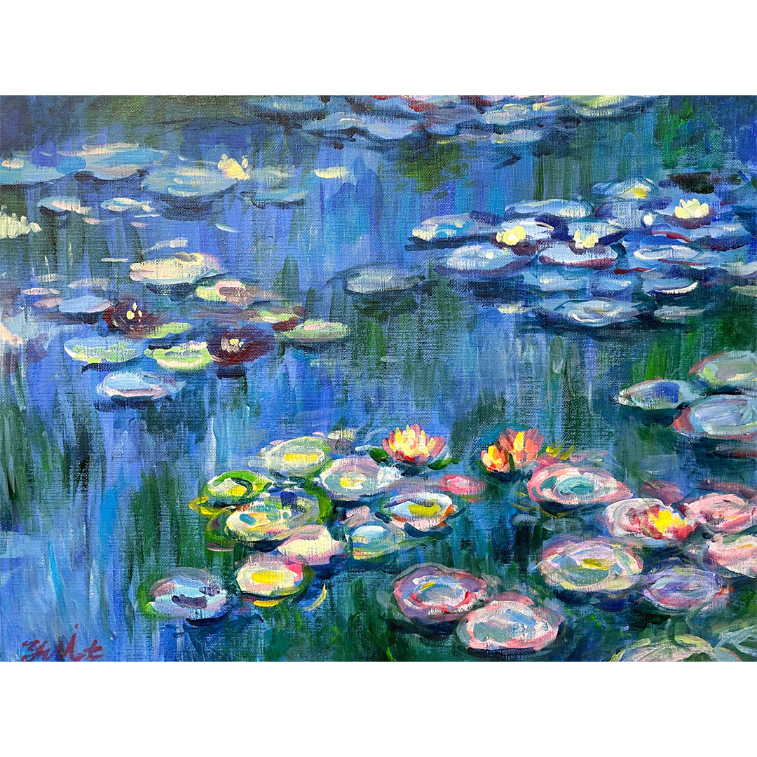 完成した作品は、静かに揺れる水面と睡蓮が放つ光の美しさに包まれた一枚となります。内面を映し出すようなその作品は、心をそっとほどく優しい時間をもたらしてくれるのではないでしょうか。