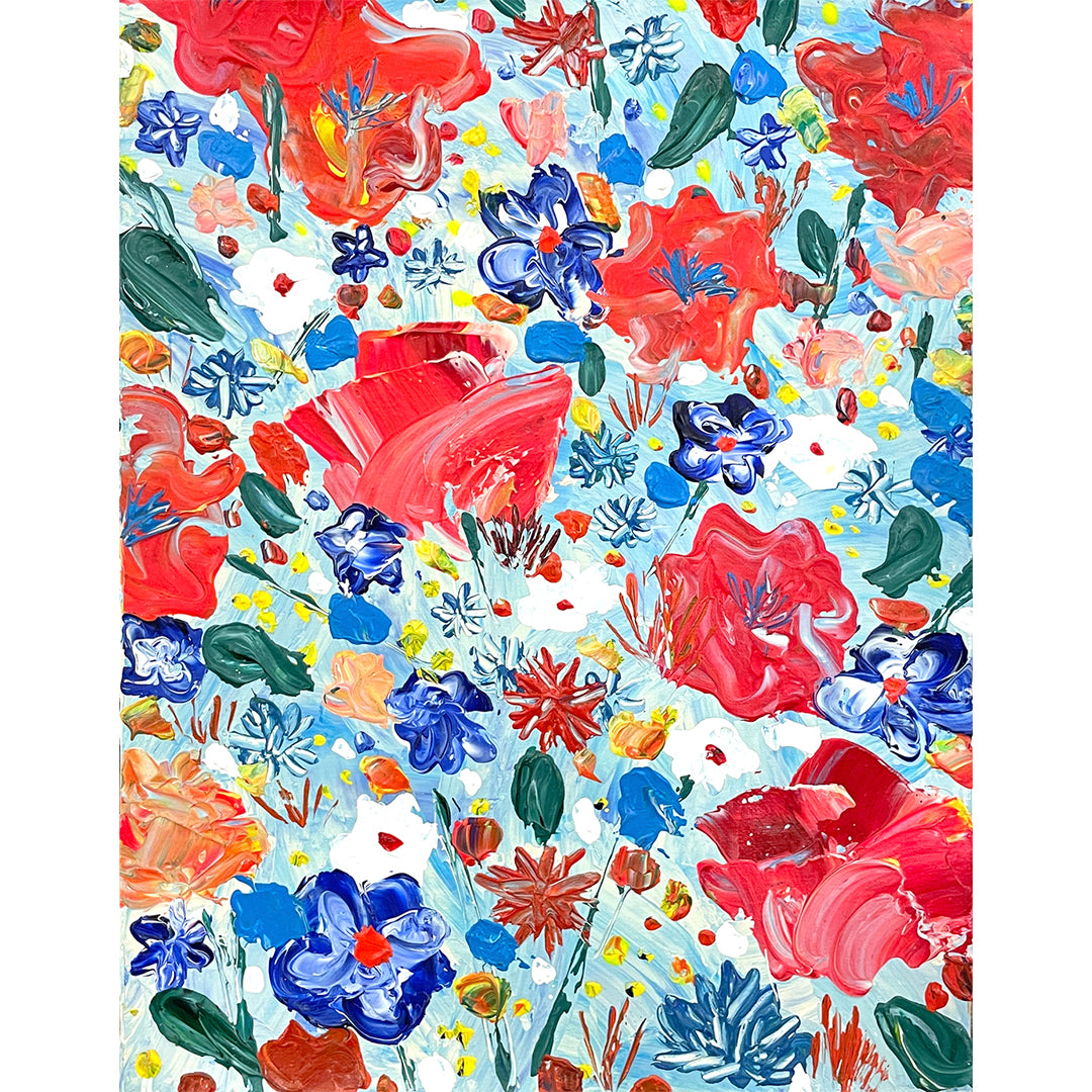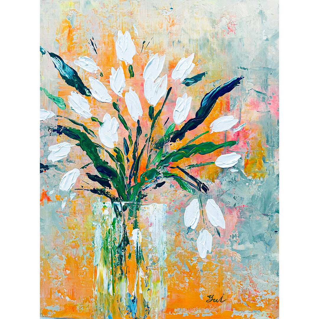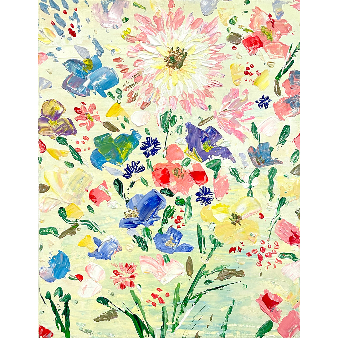 花びら一枚一枚の色彩や立体的な質感が、生き生きとした表情を宿します。色や絵の具の動きが生み出す力強さと繊細さの共存するこの作品は、画面いっぱいに自然の喜びやを華やかさが感じられる一枚に。