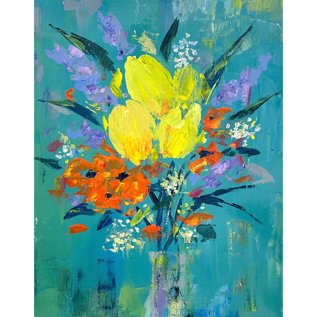 このワークショップでは、ペインティングナイフを使ってキャンバスに絵の具を乗せるようにして描いていきます。色の交わりや形の偶然性、タッチが生むリズムを楽しみながら、あなただけの“花の世界”を自由に表現していきましょう。