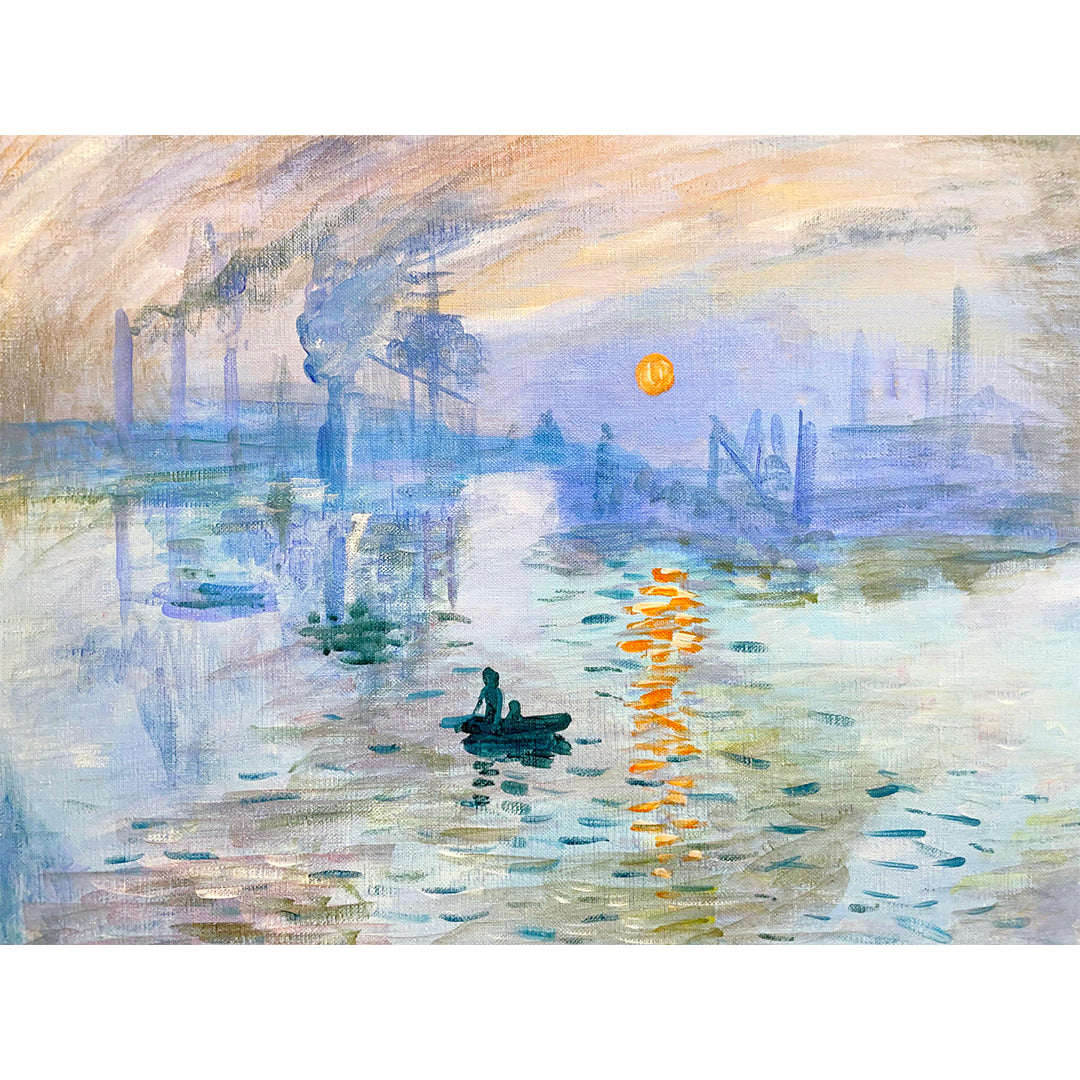 「印象・日の出」は、印象派という名前の由来となったモネの代表作。朝もやに包まれた港の景色を、淡いオレンジと青のコントラストで表現し、わずかな光の移ろいを鮮烈に描き出しています。力強くも即興的な筆致が、日の出の瞬間のドラマをキャンバスに刻んでいます。