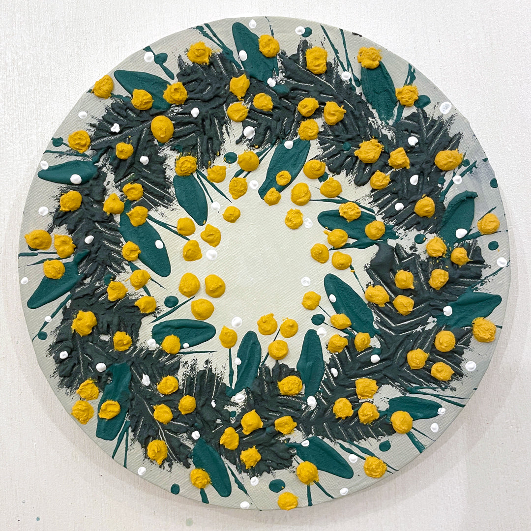 春を象徴するミモザの花を、立体的なタッチで描いたリースアートです。鮮やかな黄色と深いグリーンが心地よく響き合い、見る人に温かな喜びを届けます。円環の構図は「つながり」や「感謝」の象徴でもあります。 このワークショップでは、メディウムを混ぜた絵の具をペインティングナイフで盛り上げながら、質感豊かなリースを制作します。色を置くリズムや重ね方を楽しみつつ、ミモザのやわらかな存在感を自分らしく表現していきましょう。 完成した作品からは、陽だまりのような明るさと手仕事の温もりが感じられます。見るたびに心がやわらぐような幸福感があり、春のインテリアアートとしても華やかです。 《ワインについて》 タロ・ヴェルデカは、イタリアのプーリア州でサン・マルツァーノという生産者によって造られた白ワインです。イタリア最大の農業地帯でもあるこの地で、知る人ぞ知る名ワインを造り続け、今年創立60周年を迎えたワイナリーです。 なぜこの絵画にこのワインが選ばれたのか。その答えは、当日のワークショップでお確かめください。 *状況によりペアリングワインは予告なく変更されることがあります。あらかじめご了承下さい。