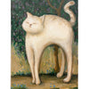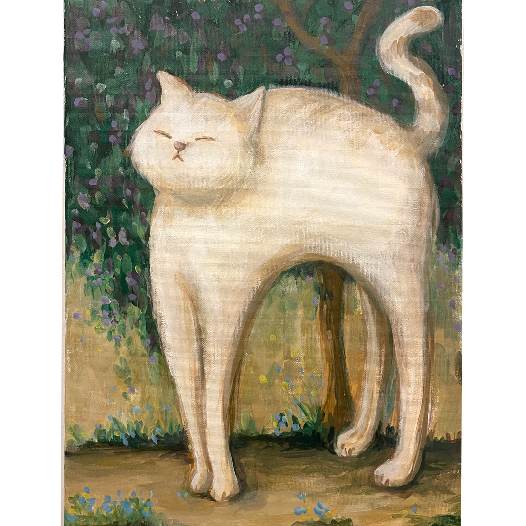 白い猫が背を反らせる一瞬を、やわらかな光と独特の構図で捉えた作品です。