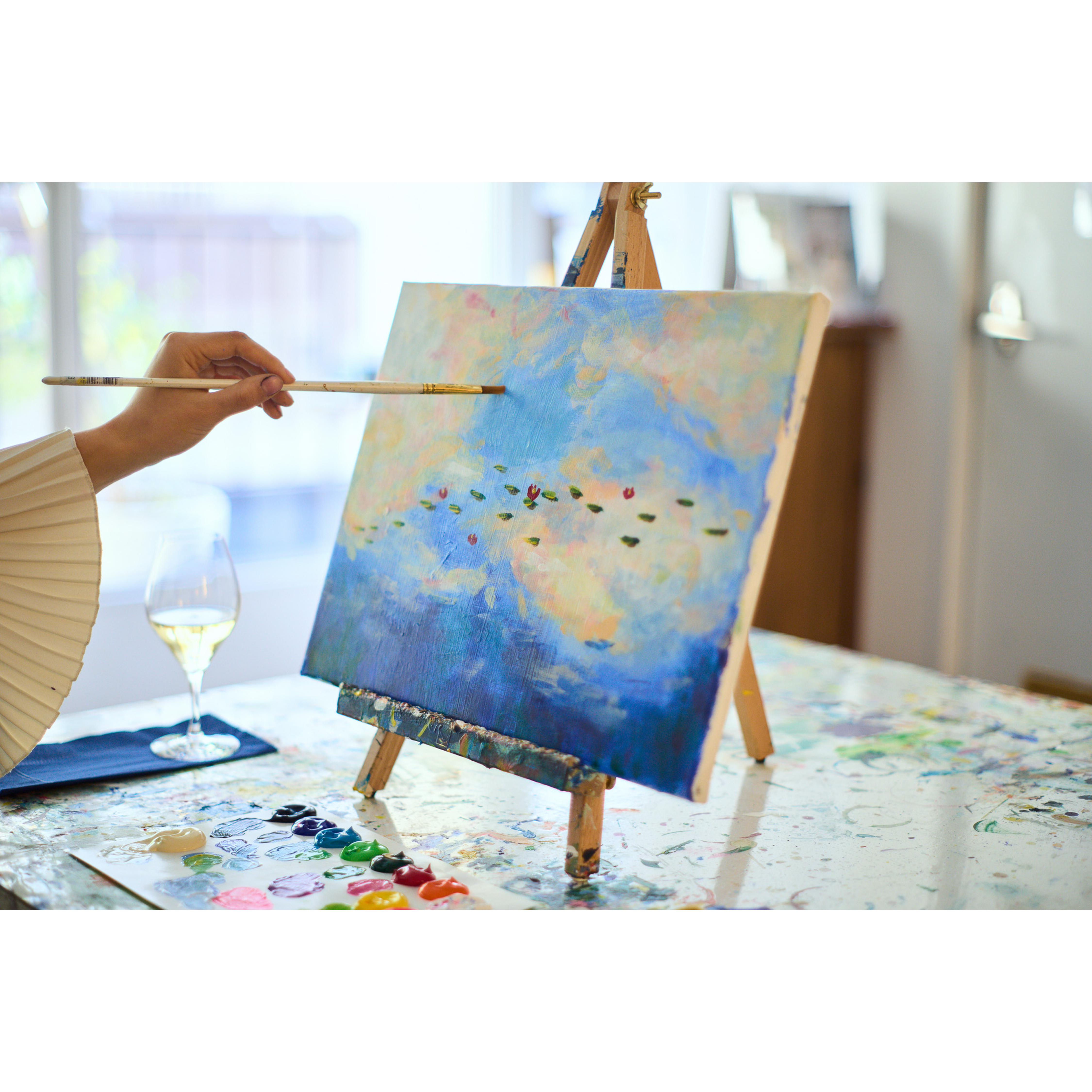 このワークショップでは、水面に映る雲や光の反射を描きながら、色彩の移ろいを捉えるモネの眼差しを体験します。筆を重ねるごとに、水の静けさや空の広がりを感じ取り、自然とひとつになるような穏やかな時間が流れていきます。